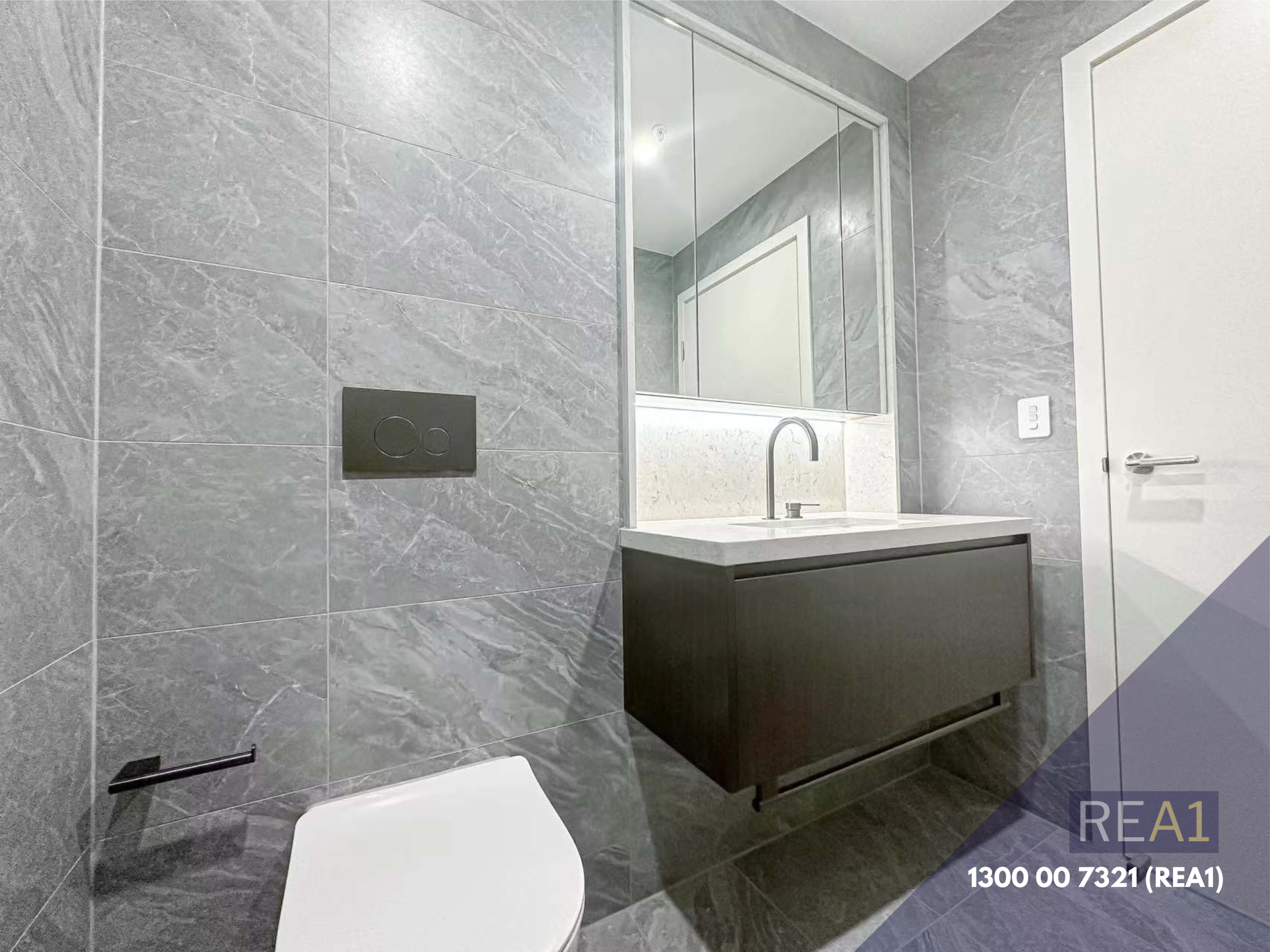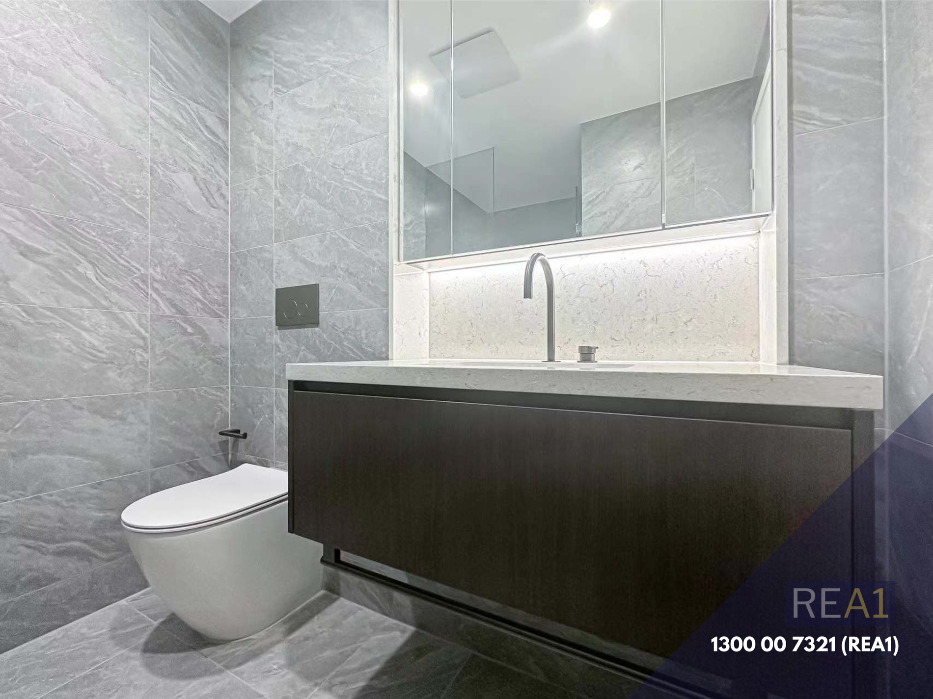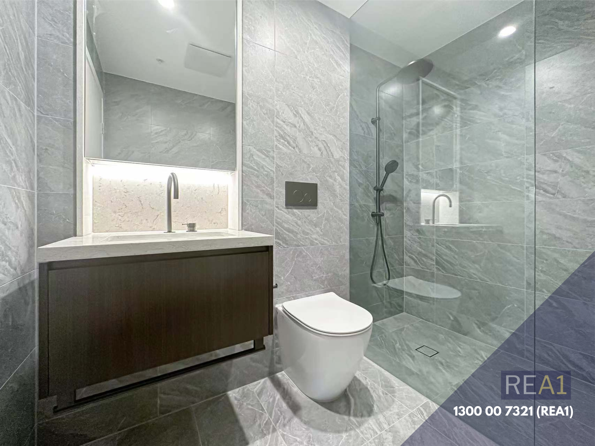 - Modern bathroom fully tiled with plenty of vanity storage